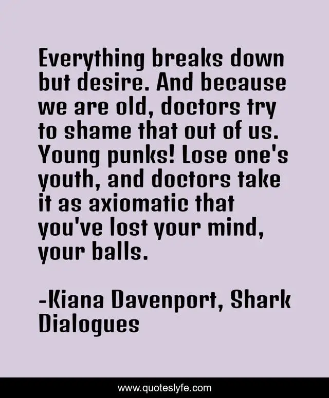 This page presents the quote "Everything breaks down but desire. And because we are old, doctors try to shame that out of us. Young punks! Lose one's youth, and doctors take it as axiomatic that you've lost your mind, your balls.". Author of this quote is Kiana Davenport, Shark Dialogues. This quote is about desire, aging, aging-gracefully,.