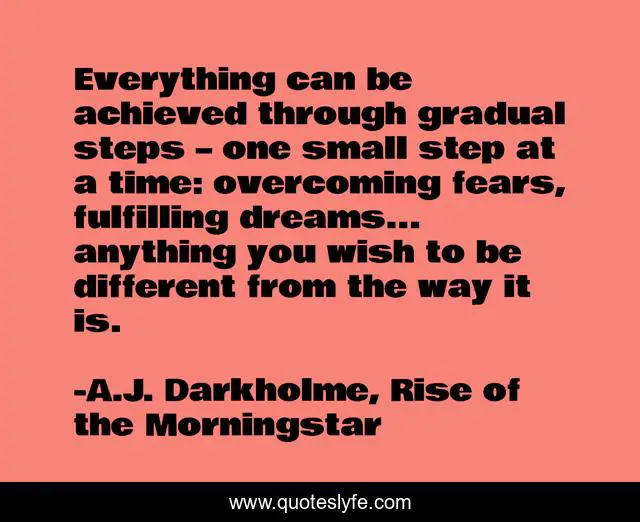 This page presents the quote "Everything can be achieved through gradual steps – one small step at a time: overcoming fears, fulfilling dreams... anything you wish to be different from the way it is.". Author of this quote is A.J. Darkholme, Rise of the Morningstar. This quote is about small-steps, fears, wishing, overcoming, wishes, self-improvement, dreams, achieving, change,.