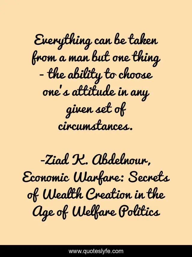 This page presents the quote "Everything can be taken from a man but one thing - the ability to choose one's attitude in any given set of circumstances.". Author of this quote is Ziad K. Abdelnour, Economic Warfare: Secrets of Wealth Creation in the Age of Welfare Politics. This quote is about behaviour, attitude,.