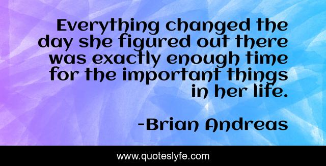 This page presents the quote "Everything changed the day she figured out there was exactly enough time for the important things in her life.". Author of this quote is Brian Andreas. This quote is about enthusiasm, inspirational, time,.
