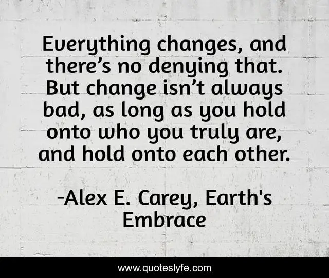 "Alex E. Carey, Earth's Embrace Quotes." Quoteslyfe.com, 2025. Fri. 05 Dec. 2025. <https://www.quoteslyfe.com/quote/Everything-changes-and-there-s-no-denying-82823>.
