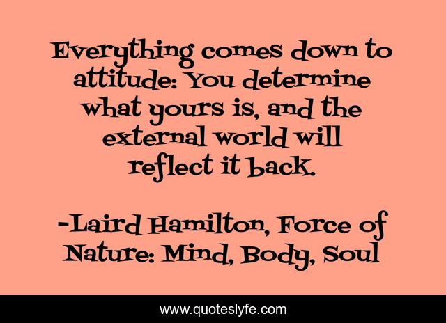 "Laird Hamilton, Force of Nature: Mind, Body, Soul Quotes." Quoteslyfe.com, 2025. Mon. 08 Dec. 2025. <https://www.quoteslyfe.com/quote/Everything-comes-down-to-attitude-You-determine-179753>.