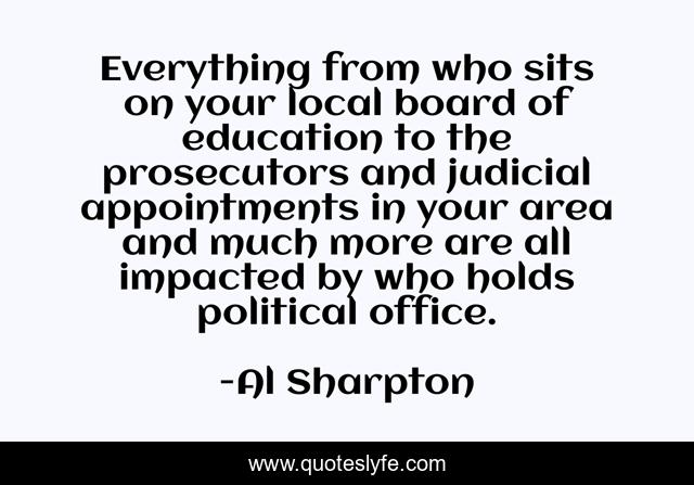 This page presents the quote "Everything from who sits on your local board of education to the prosecutors and judicial appointments in your area and much more are all impacted by who holds political office.". Author of this quote is Al Sharpton. This quote is about political, office,.