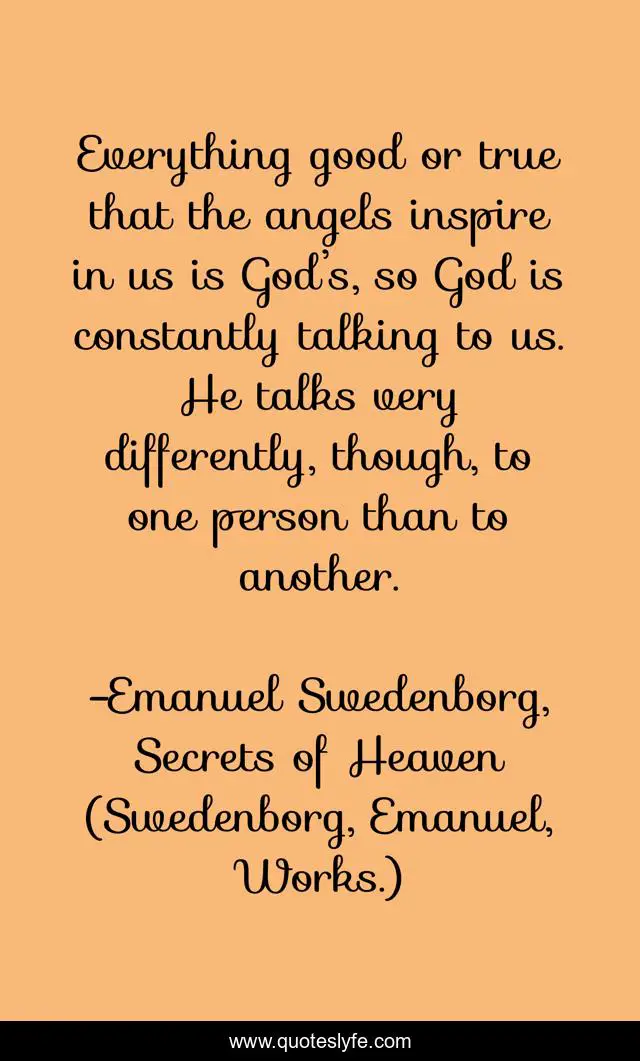 This page presents the quote "Everything good or true that the angels inspire in us is God’s, so God is constantly talking to us. He talks very differently, though, to one person than to another.". Author of this quote is Emanuel Swedenborg, Secrets of Heaven (Swedenborg, Emanuel, Works.). This quote is about heaven, god, swedenborg, truth, angels, inspiration,.