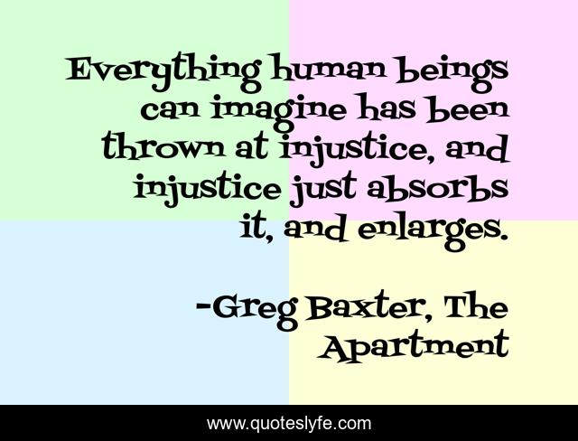 This page presents the quote "Everything human beings can imagine has been thrown at injustice, and injustice just absorbs it, and enlarges.". Author of this quote is Greg Baxter, The Apartment. .