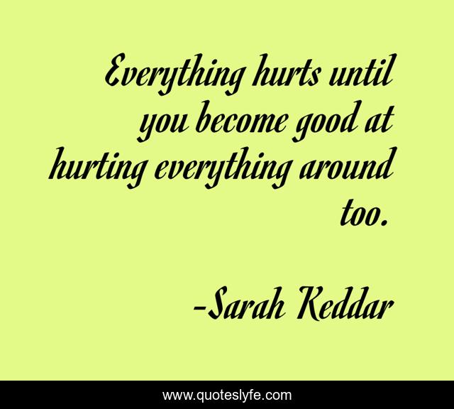 This page presents the quote "Everything hurts until you become good at hurting everything around too.". Author of this quote is Sarah Keddar. This quote is about hurting, feelings, sadness, hurt, sad, fact,.