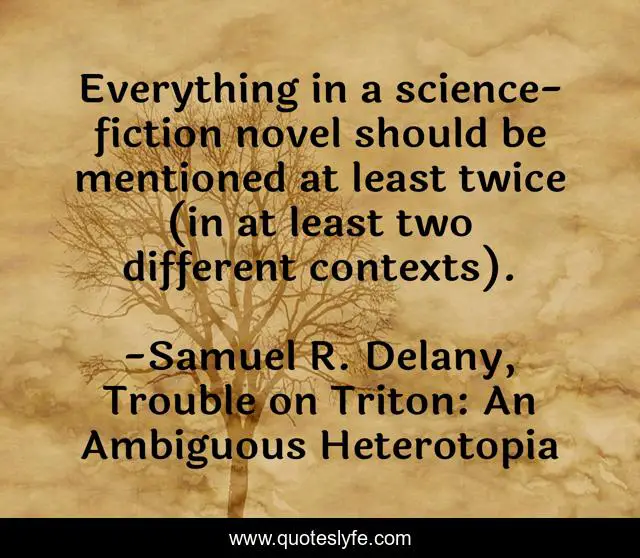 This page presents the quote "Everything in a science-fiction novel should be mentioned at least twice (in at least two different contexts).". Author of this quote is Samuel R. Delany, Trouble on Triton: An Ambiguous Heterotopia. .