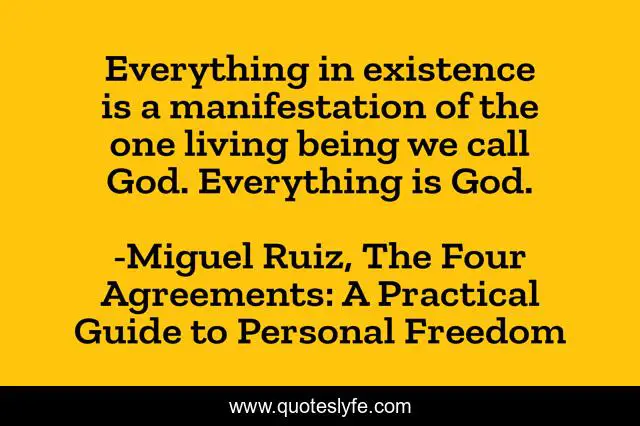 This page presents the quote "Everything in existence is a manifestation of the one living being we call God. Everything is God.". Author of this quote is Miguel Ruiz, The Four Agreements: A Practical Guide to Personal Freedom. .