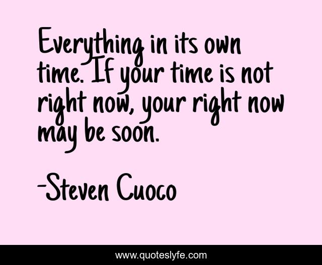 This page presents the quote "Everything in its own time. If your time is not right now, your right now may be soon.". Author of this quote is Steven Cuoco. This quote is about inspirational, quote-of-the-day, words-of-wisdom, quotes-to-live-by, enthusiasm, brainy-words,.