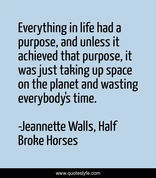 This page presents the quote "Everything in life had a purpose, and unless it achieved that purpose, it was just taking up space on the planet and wasting everybody's time.". Author of this quote is Jeannette Walls, Half Broke Horses. This quote is about god, life, purpose, time,.