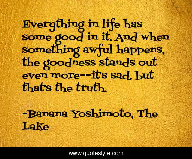 This page presents the quote "Everything in life has some good in it. And when something awful happens, the goodness stands out even more--it's sad, but that's the truth.". Author of this quote is Banana Yoshimoto, The Lake. This quote is about good, truth,.