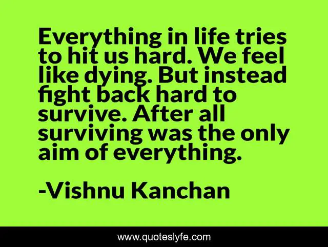 This page presents the quote "Everything in life tries to hit us hard. We feel like dying. But instead fight back hard to survive. After all surviving was the only aim of everything.". Author of this quote is Vishnu Kanchan. This quote is about inpirational, success,.