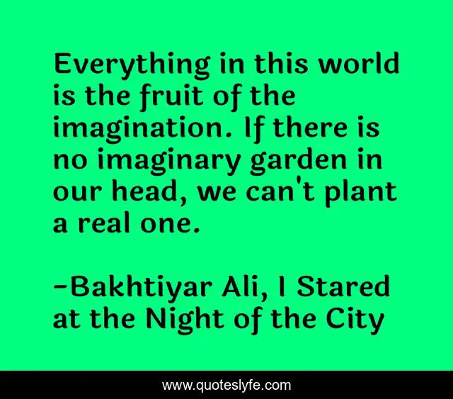 This page presents the quote "Everything in this world is the fruit of the imagination. If there is no imaginary garden in our head, we can't plant a real one.". Author of this quote is Bakhtiyar Ali, I Stared at the Night of the City. .