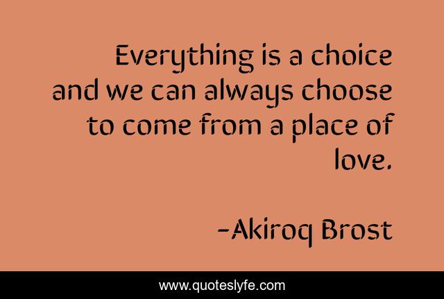 This page presents the quote "Everything is a choice and we can always choose to come from a place of love.". Author of this quote is Akiroq Brost. This quote is about love, affection, choice,.