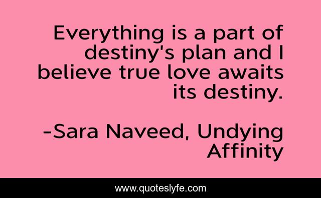 This page presents the quote "Everything is a part of destiny’s plan and I believe true love awaits its destiny.". Author of this quote is Sara Naveed, Undying Affinity. This quote is about romance, love, destiny, relationship, truelove, saranaveed, undyingaffinity, affection,.