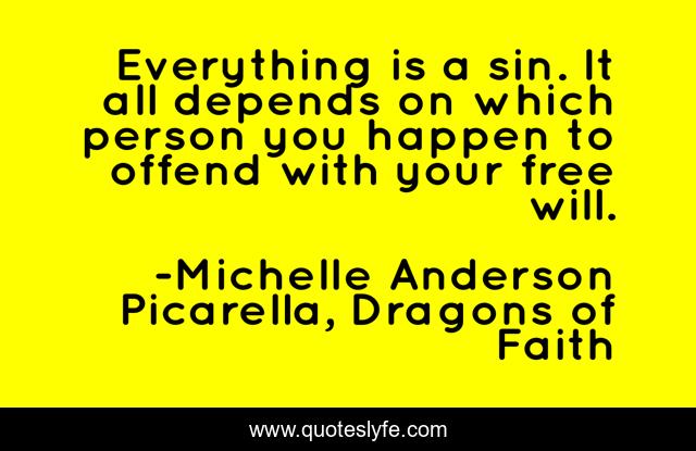 This page presents the quote "Everything is a sin. It all depends on which person you happen to offend with your free will.". Author of this quote is Michelle Anderson Picarella, Dragons of Faith. This quote is about faith, sin, dragons,.