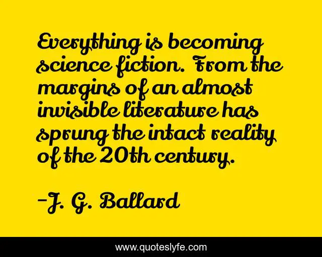 This page presents the quote "Everything is becoming science fiction. From the margins of an almost invisible literature has sprung the intact reality of the 20th century.". Author of this quote is J. G. Ballard. This quote is about literature, reality,.