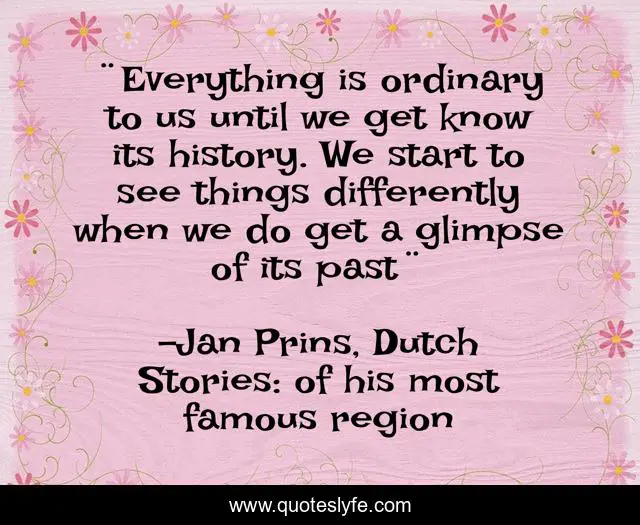 This page presents the quote "¨Everything is ordinary to us until we get know its history. We start to see things differently when we do get a glimpse of its past¨". Author of this quote is Jan Prins, Dutch Stories: of his most famous region. This quote is about stories, dutch,.