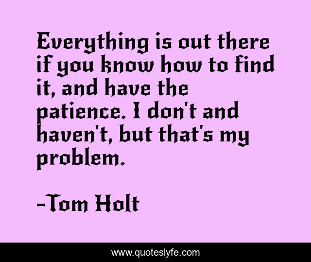 This page presents the quote "Everything is out there if you know how to find it, and have the patience. I don't and haven't, but that's my problem.". Author of this quote is Tom Holt. .