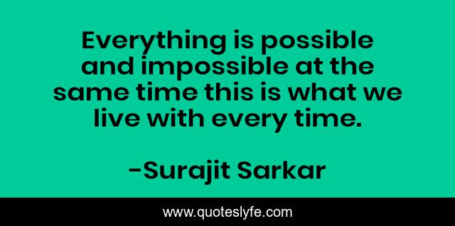 This page presents the quote "Everything is possible and impossible at the same time this is what we live with every time.". Author of this quote is Surajit Sarkar. This quote is about life-philosophy, life-and-living, life-lessons,.