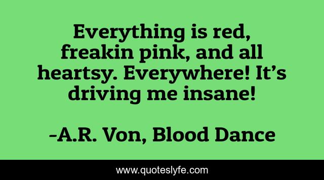 This page presents the quote "Everything is red, freakin pink, and all heartsy. Everywhere! It’s driving me insane!". Author of this quote is A.R. Von, Blood Dance. This quote is about anti-valentine, a-r-von, demon, erotic, blood-dance, thriller,.