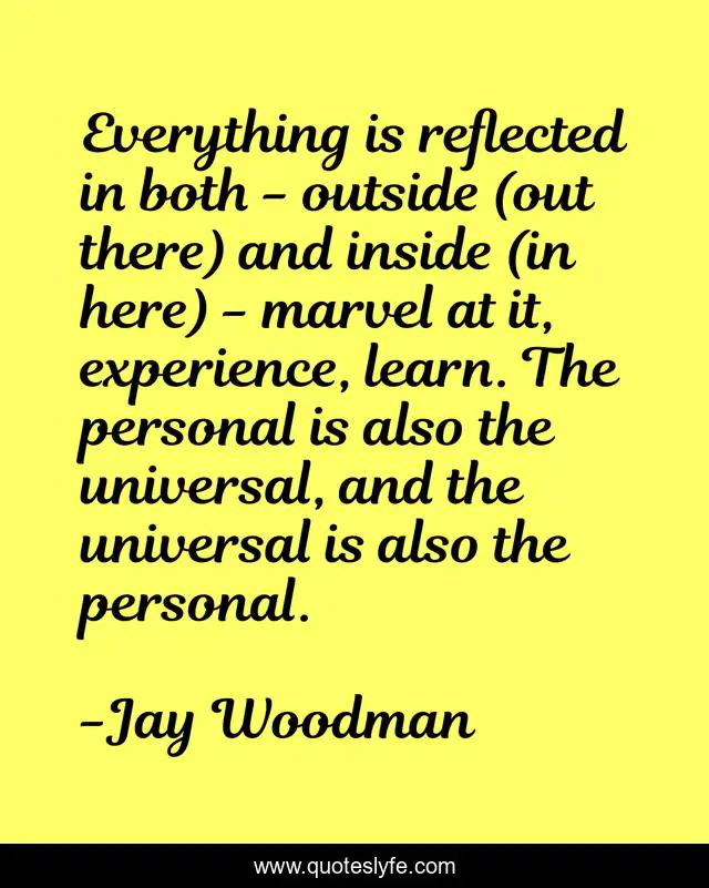 This page presents the quote "Everything is reflected in both - outside (out there) and inside (in here) - marvel at it, experience, learn. The personal is also the universal, and the universal is also the personal.". Author of this quote is Jay Woodman. This quote is about reflection, personal, universal, learn, experience, mirror, life-philosophy, marvel,.