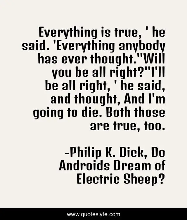 This page presents the quote "Everything is true, ' he said. 'Everything anybody has ever thought.''Will you be all right?''I'll be all right, ' he said, and thought, And I'm going to die. Both those are true, too.". Author of this quote is Philip K. Dick, Do Androids Dream of Electric Sheep?. This quote is about thought, life, death, truth,.