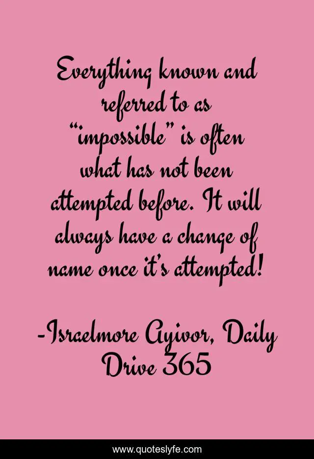 "Israelmore Ayivor, Daily Drive 365 Quotes." Quoteslyfe.com, 2025. Fri. 05 Dec. 2025. <https://www.quoteslyfe.com/quote/Everything-known-and-referred-to-as-impossible-129420>.