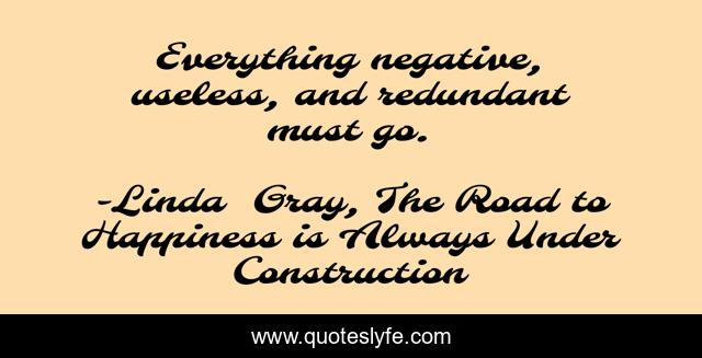 This page presents the quote "Everything negative, useless, and redundant must go.". Author of this quote is Linda Gray, The Road to Happiness is Always Under Construction. This quote is about advice, inspiration, positivity, self-help,.