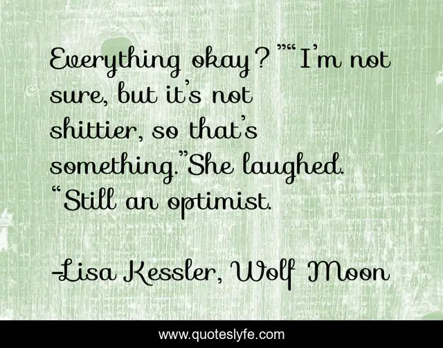 This page presents the quote "Everything okay?”“I’m not sure, but it’s not shittier, so that’s something.”She laughed. “Still an optimist.". Author of this quote is Lisa Kessler, Wolf Moon. This quote is about urban-fantasy-romance, paranormal-romance, shifter-romance,.