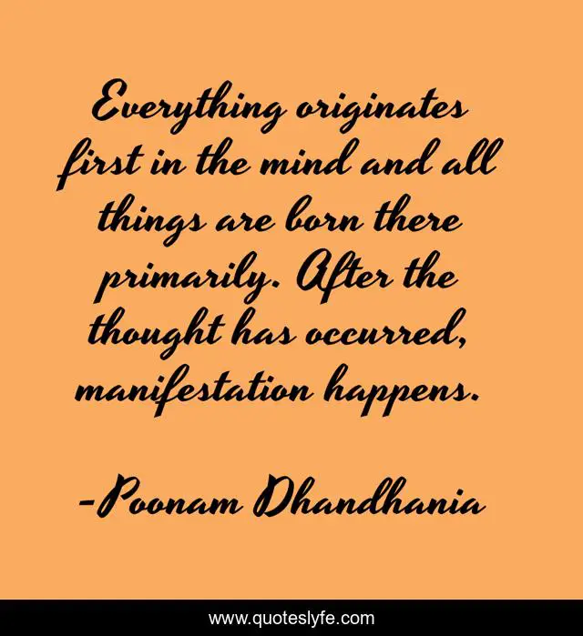 This page presents the quote "Everything originates first in the mind and all things are born there primarily. After the thought has occurred, manifestation happens.". Author of this quote is Poonam Dhandhania. .