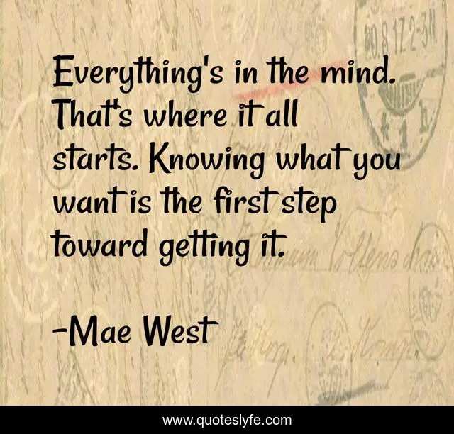 This page presents the quote "Everything's in the mind. That's where it all starts. Knowing what you want is the first step toward getting it.". Author of this quote is Mae West. .
