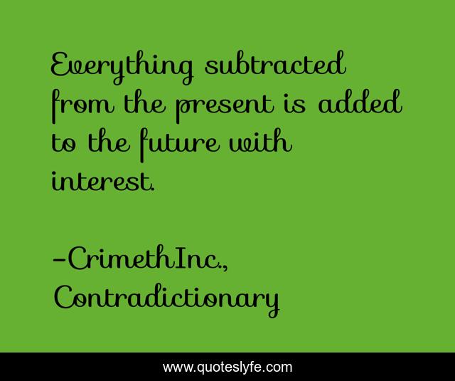 "CrimethInc., Contradictionary Quotes." Quoteslyfe.com, 2025. Fri. 05 Dec. 2025. <https://www.quoteslyfe.com/quote/Everything-subtracted-from-the-present-is-added-110401>.
