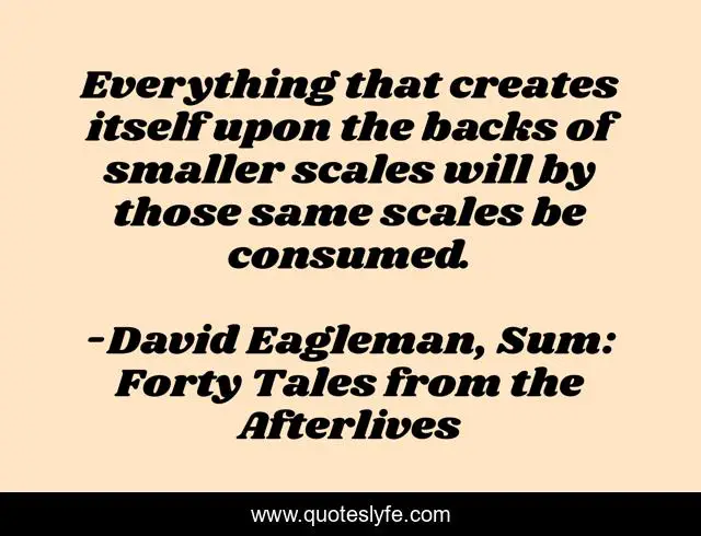 This page presents the quote "Everything that creates itself upon the backs of smaller scales will by those same scales be consumed.". Author of this quote is David Eagleman, Sum: Forty Tales from the Afterlives. This quote is about justice, creation,.
