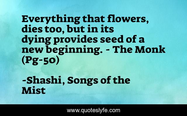This page presents the quote "Everything that flowers, dies too, but in its dying provides seed of a new beginning. - The Monk (Pg-50)". Author of this quote is Shashi, Songs of the Mist. This quote is about songs-of-the-mist, life, dying-well,.