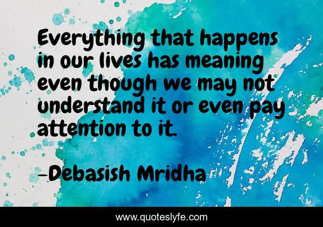 This page presents the quote "Everything that happens in our lives has meaning even though we may not understand it or even pay attention to it.". Author of this quote is Debasish Mridha. This quote is about our-lives, pay-attention, everything-has-meaning, philosophy, debasish-mridha, quotes, lives, debasish-mridha-md, inspirational,.