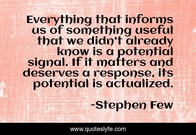 This page presents the quote "Everything that informs us of something useful that we didn't already know is a potential signal. If it matters and deserves a response, its potential is actualized.". Author of this quote is Stephen Few. This quote is about information, data, data-analysis, data-mining,.