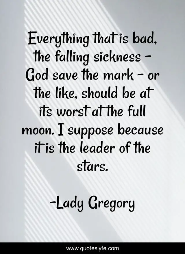This page presents the quote "Everything that is bad, the falling sickness - God save the mark - or the like, should be at its worst at the full moon. I suppose because it is the leader of the stars.". Author of this quote is Lady Gregory. This quote is about leader, stars, moon,.