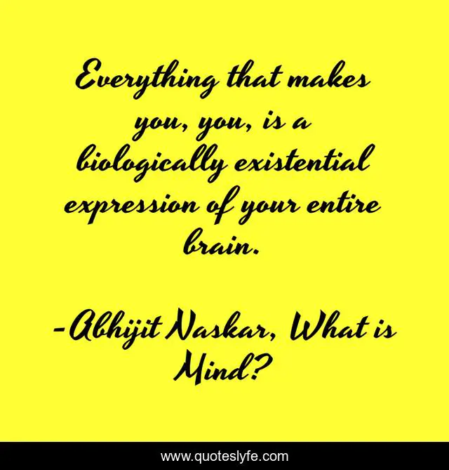 This page presents the quote "Everything that makes you, you, is a biologically existential expression of your entire brain.". Author of this quote is Abhijit Naskar, What is Mind?. This quote is about inspiring, brainy, life-lessons, inspiration, human-nature, life, human-mind, brain, science-of-mind,.