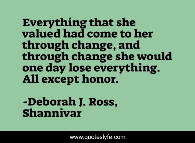 This page presents the quote "Everything that she valued had come to her through change, and through change she would one day lose everything. All except honor.". Author of this quote is Deborah J. Ross, Shannivar. This quote is about honor, change,.
