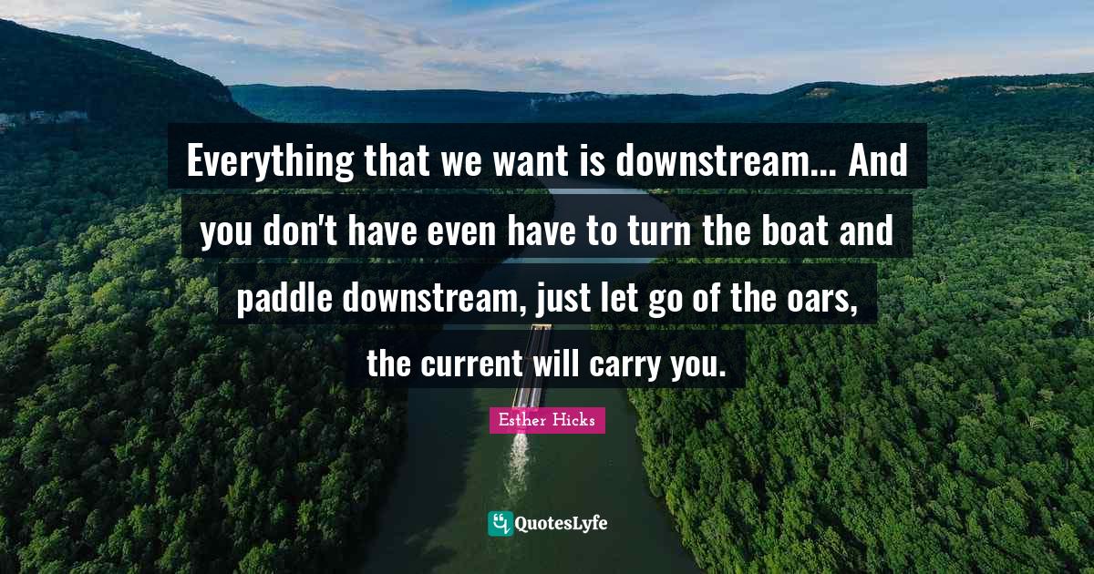 This page presents the quote "Everything that we want is downstream... And you don't have even have to turn the boat and paddle downstream, just let go of the oars, the current will carry you.". Author of this quote is Esther Hicks. This quote is about letting go, just let go, boat,.