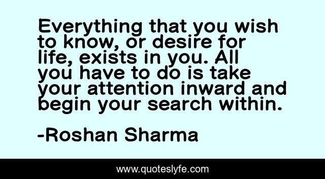 This page presents the quote "Everything that you wish to know, or desire for life, exists in you. All you have to do is take your attention inward and begin your search within.". Author of this quote is Roshan Sharma. This quote is about desire, knowing, search, knowledge, attention, seek,.