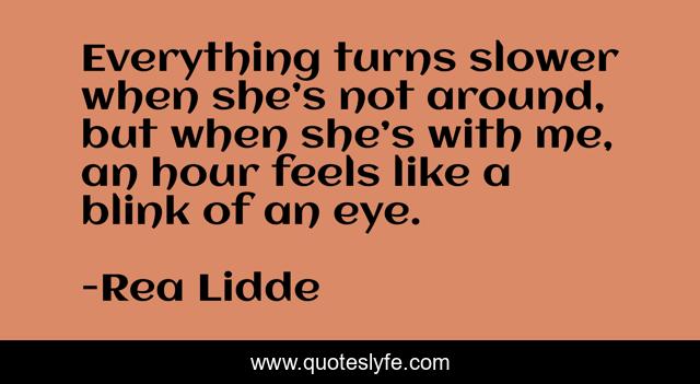 This page presents the quote "Everything turns slower when she’s not around, but when she’s with me, an hour feels like a blink of an eye.". Author of this quote is Rea Lidde. This quote is about sweet, love, time-passing, affection,.