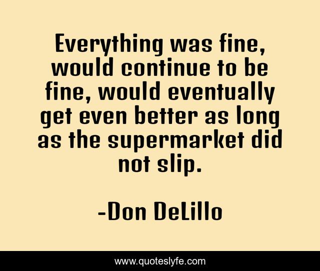 This page presents the quote "Everything was fine, would continue to be fine, would eventually get even better as long as the supermarket did not slip.". Author of this quote is Don DeLillo. This quote is about supermarkets, humor, consumerism, future, satire,.