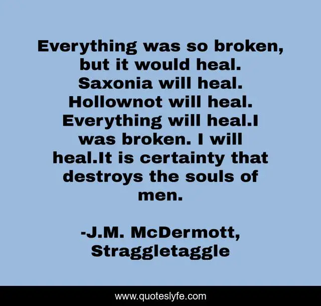 This page presents the quote "Everything was so broken, but it would heal. Saxonia will heal. Hollownot will heal. Everything will heal.I was broken. I will heal.It is certainty that destroys the souls of men.". Author of this quote is J.M. McDermott, Straggletaggle. This quote is about recovery, hope,.