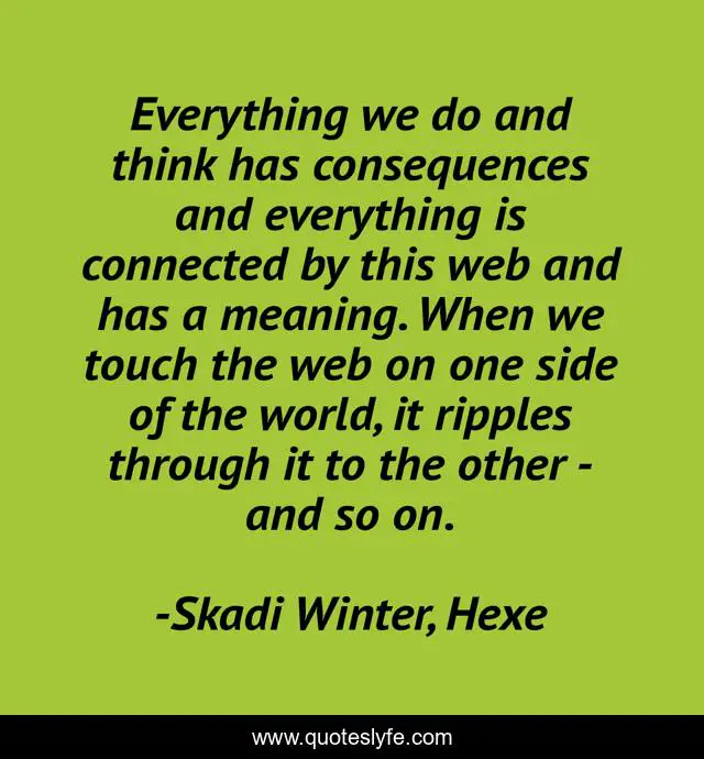 This page presents the quote "Everything we do and think has consequences and everything is connected by this web and has a meaning. When we touch the web on one side of the world, it ripples through it to the other - and so on.". Author of this quote is Skadi Winter, Hexe. This quote is about world, meaning, consequences,.
