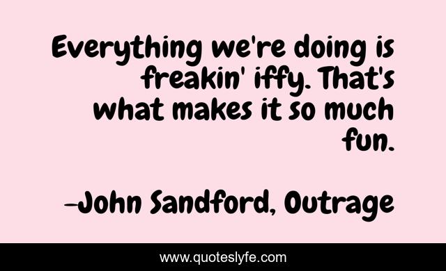 This page presents the quote "Everything we're doing is freakin' iffy. That's what makes it so much fun.". Author of this quote is John Sandford, Outrage. This quote is about fun, mgg, chances, havoc, john-sandford, michele-cook, iffy, outrage, the-singular-menace,.