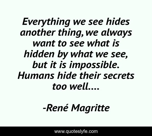 This page presents the quote "Everything we see hides another thing, we always want to see what is hidden by what we see, but it is impossible. Humans hide their secrets too well....". Author of this quote is René Magritte. This quote is about philosophy, art,.