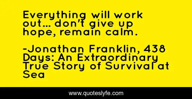This page presents the quote "Everything will work out... don't give up hope, remain calm.". Author of this quote is Jonathan Franklin, 438 Days: An Extraordinary True Story of Survival at Sea. This quote is about mantra, survival, hope,.