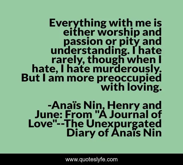 This page presents the quote "Everything with me is either worship and passion or pity and understanding. I hate rarely, though when I hate, I hate murderously. But I am more preoccupied with loving.". Author of this quote is Anaïs Nin, Henry and June: From "A Journal of Love"--The Unexpurgated Diary of Anaïs Nin. This quote is about hate, loving,.